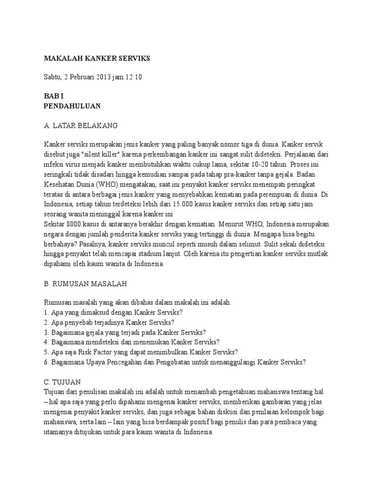 Jurnal riset hesti medan, vol. Jurnal pengertian kanker serviks menurut para ahli. Penyakit yang bisa menyebabkan kematian ini masih merupakan ancaman bagi kesejahteraan dan kesehatan manusia secara umum, masih tingginya insiden kanker serviks diindonesia disebabkan oleh beberapa faktor diantaranya kurangnya pengetahuan dan informasi tentang. Hasil penelitian ini mengungkapkan kehidupan. Dalam banyak kasus, kanker serviks terkait dengan infeksi menular seksual.
